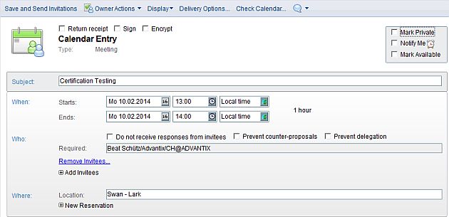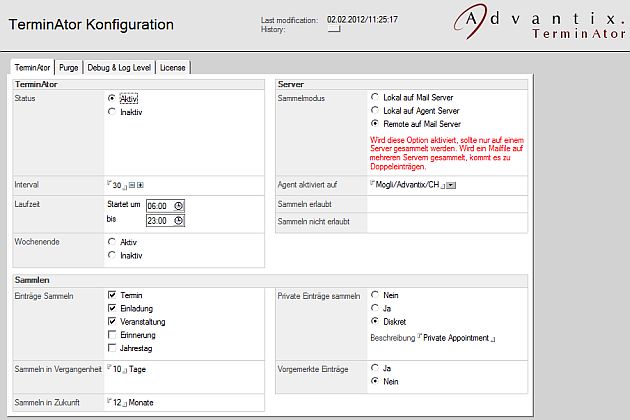 Die Termineinträge werden aus den Maildatenbanken der Benutzer gesammelt und mit den gleichen Informationen dargestellt wie im Kalender. Als „privat“ markierte Einträge werden zwar gesammelt, im Advantix. Terminator wird dann aber die genaue Beschreibung nicht angezeigt. Somit bleibt der Datenschutz gewährleistet. |