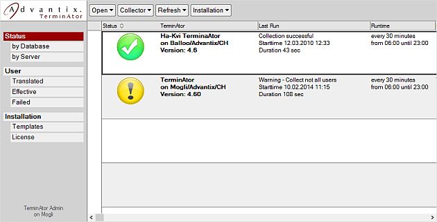 Mit der Advantix.Terminator Admin Applikation haben Sie alle Sammelagenden Ihrer Firma unter Kontrolle. Fehler und Warnungen sind auf einen Blick sichtbar. Gleichzeitig erstellen Sie benötigte Agenden direkt aus der Applikation. |
